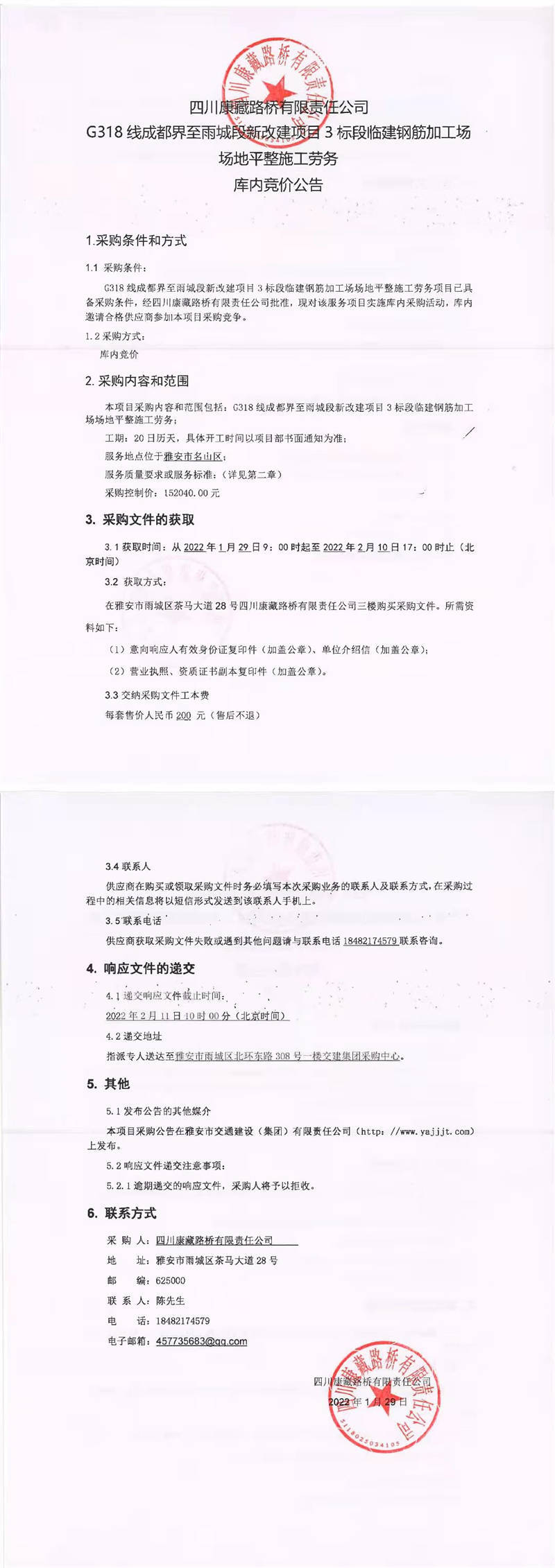 四川康藏路橋有限責(zé)任公司G318線成都界至雨城段新改建項目3標(biāo)段臨建鋼筋加工場場地平整施工勞務(wù)庫內(nèi)競價公告