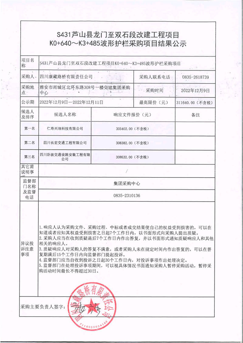 四川康藏路橋有限責任公司S431蘆山縣龍門至雙石段改建工程項目K0+640~K3+485波形護欄采購項目結(jié)果公示