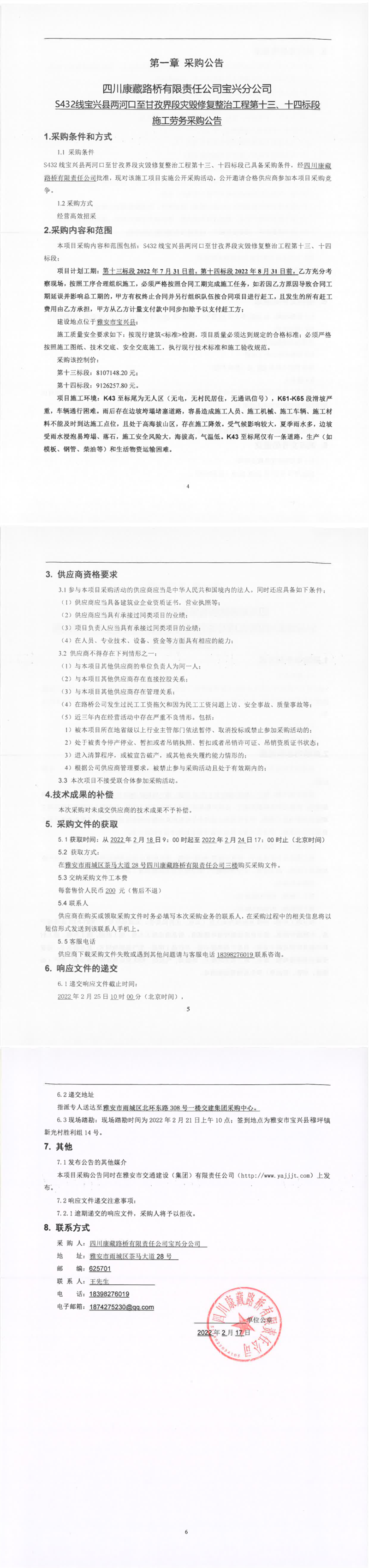 四川康藏路橋有限責(zé)任公司S432線寶興縣兩河口至甘孜界段災(zāi)毀修復(fù)整治工程第十三、十四標(biāo)段施工勞務(wù)采購公告