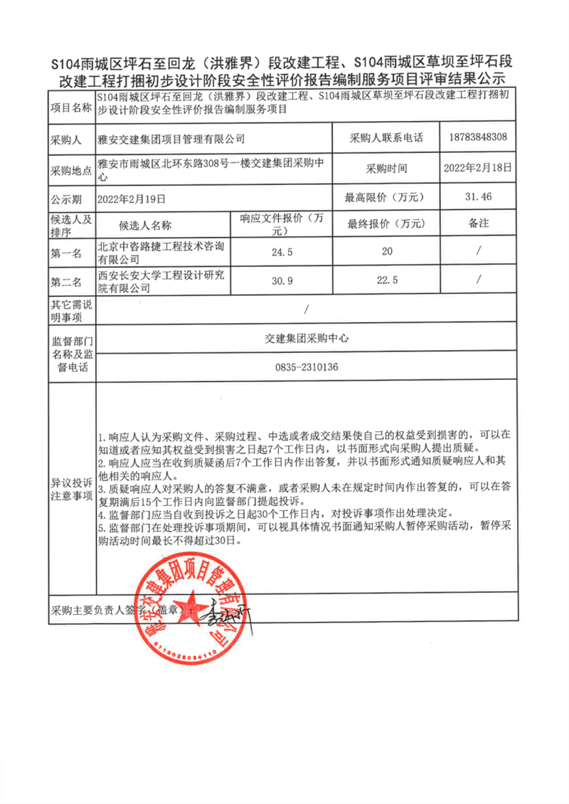 雅安交建集團項目管理有限公司S104雨城區(qū)坪石至回龍(洪雅界)段改建工程、S104雨城區(qū)草壩至坪石段改建工程打捆初步設(shè)計階段安全性評價報告編制服務項目評審結(jié)果公示