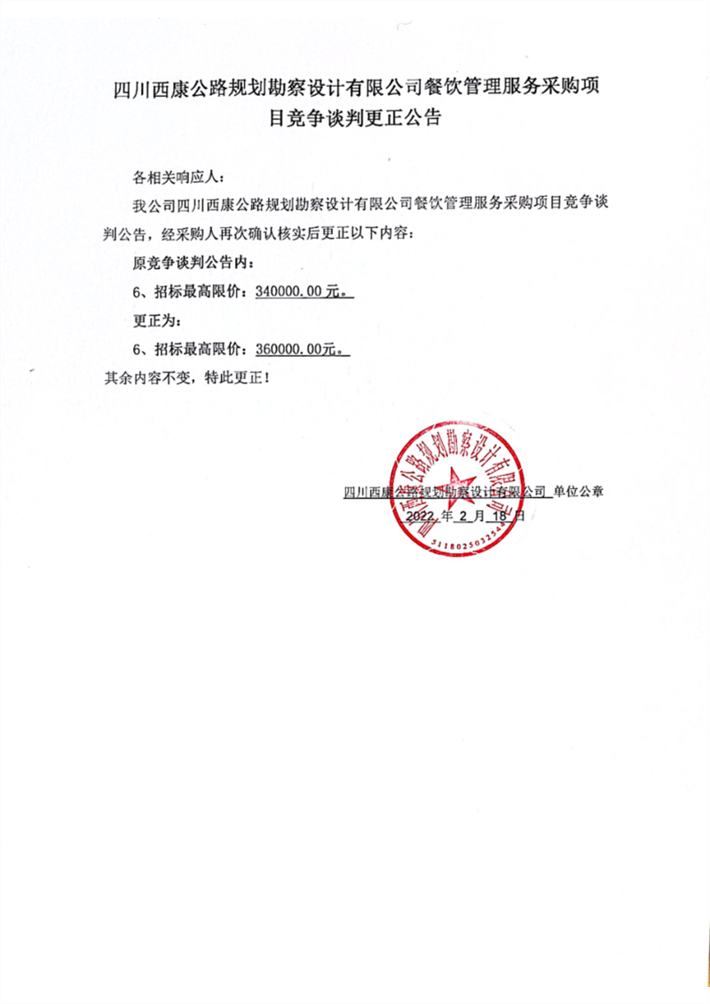 四川西康公路規(guī)劃勘察設(shè)計(jì)有限公司餐飲管理服務(wù)采購項(xiàng)目競爭談判更正公告(第二次)