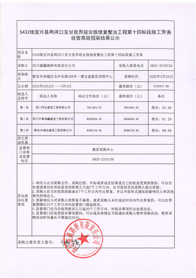 四川康藏路橋有限責(zé)任公司S432線寶興縣兩河口至甘孜界段災(zāi)毀修復(fù)整治工程第十四標(biāo)段施工勞務(wù)經(jīng)營高效招采結(jié)果公示