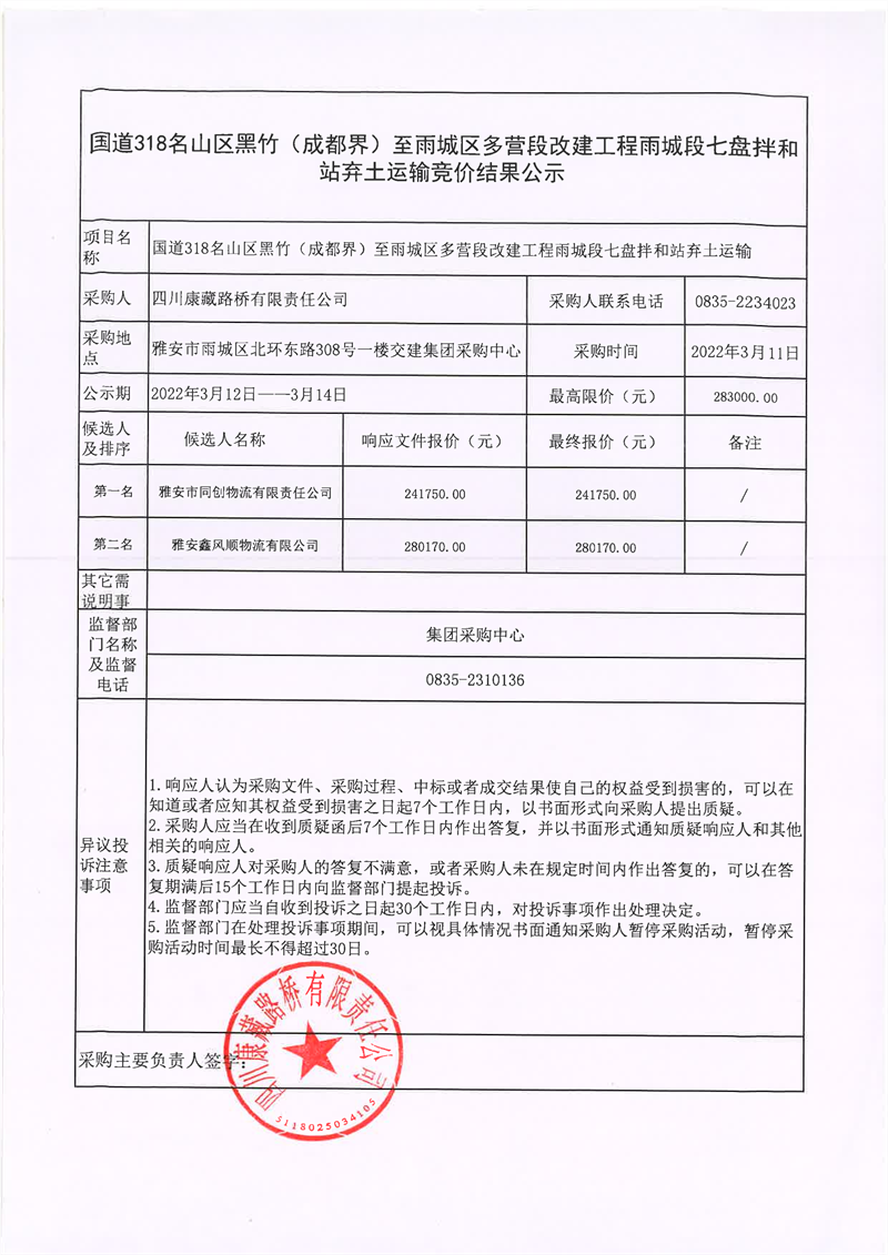 四川康藏路橋有限責任公司國道318名山區(qū)黑竹(成都界)至雨城區(qū)多營段改建工程雨城段七盤拌和站棄土運輸競價結(jié)果公示