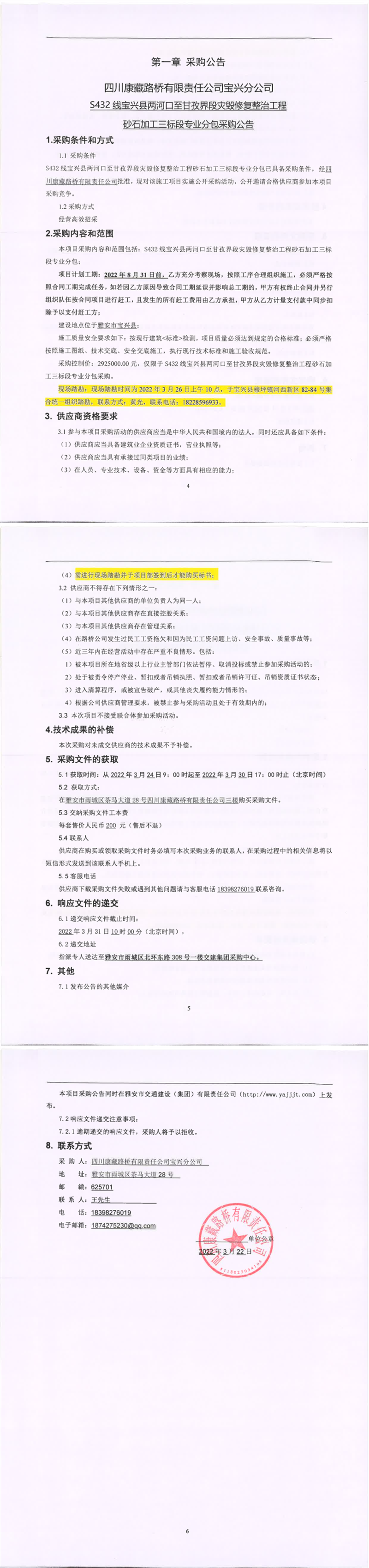 四川康藏路橋有限責任公司S432線寶興縣兩河口至甘孜界段災毀修復整治工程砂石加工三標段專業(yè)分包采購公告