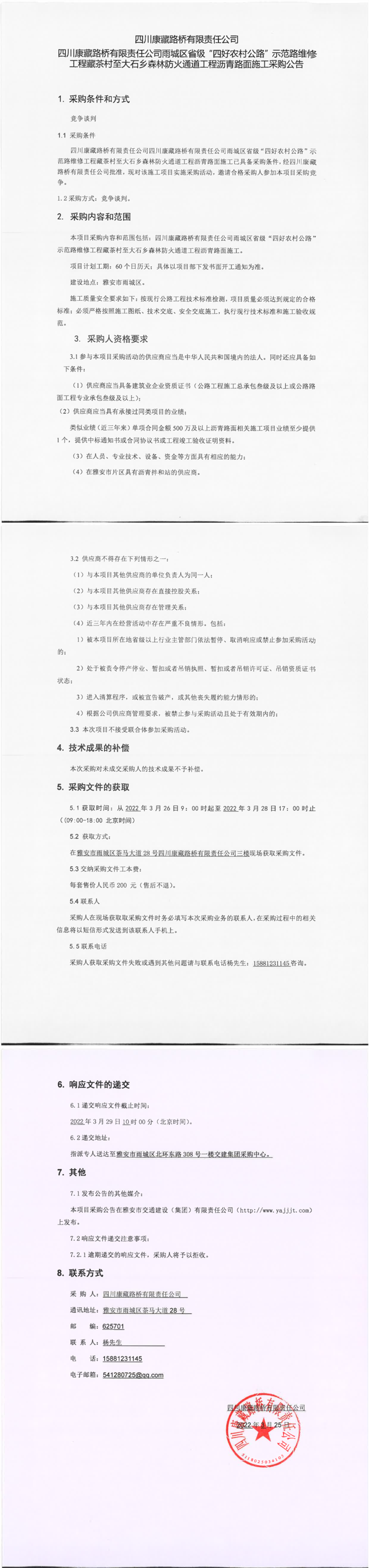 四川康藏路橋有限責(zé)任公司雨城區(qū)省級“四好農(nóng)村公路”示范路維修工程藏茶村至大石鄉(xiāng)森林防火通道工程瀝青路面施工采購公告