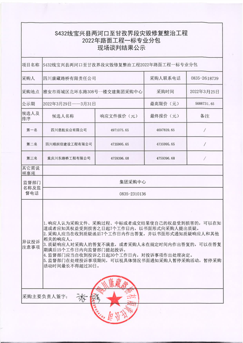 四川康藏路橋有限責任公司S432線寶興縣兩河口至甘孜界段災(zāi)毀修復(fù)整治工程2022年路面工程一標專業(yè)分包現(xiàn)場談判結(jié)果公示