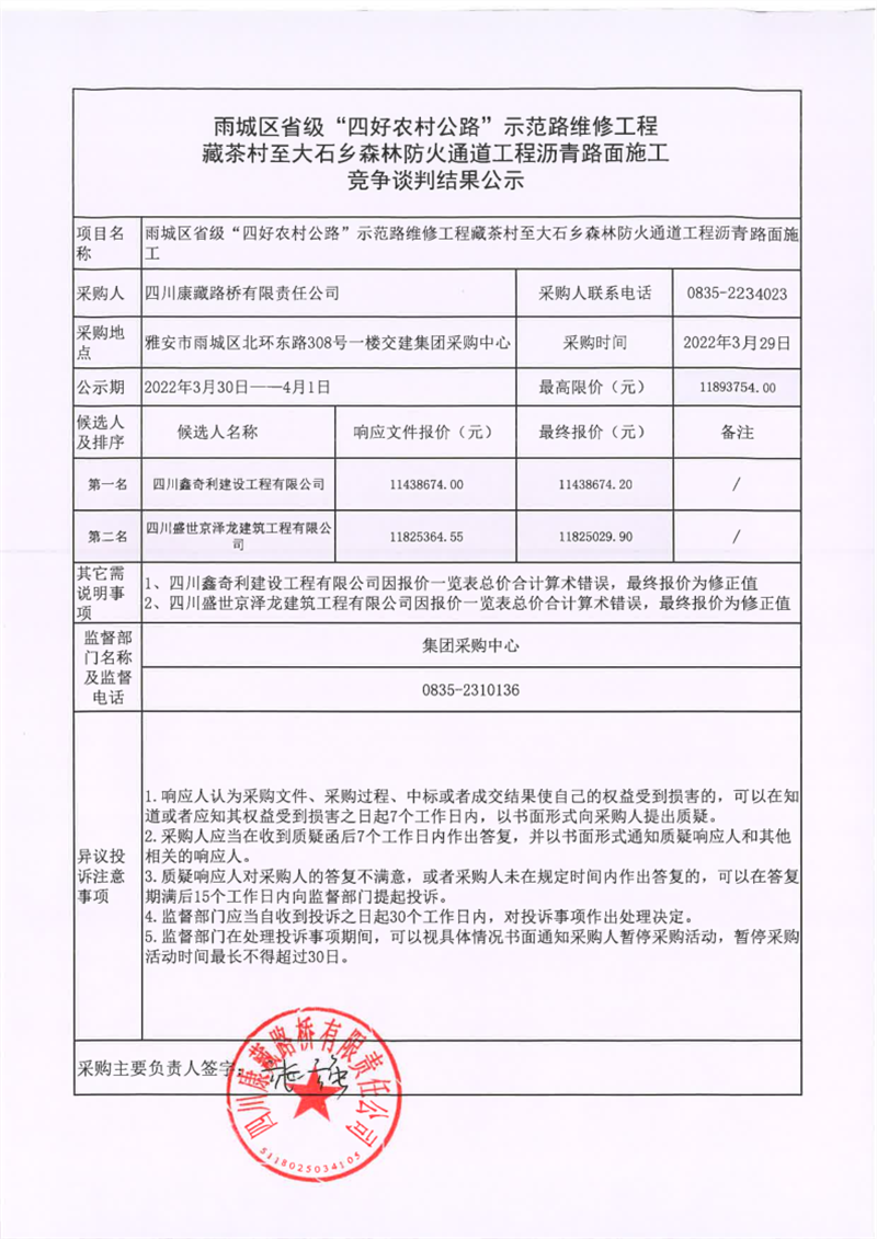 四川康藏路橋有限責任公司雨城區(qū)省級“四好農(nóng)村公路”示范路維修工程藏茶村至大石鄉(xiāng)森林防火通道工程瀝青路面施工競爭談判結(jié)果公示