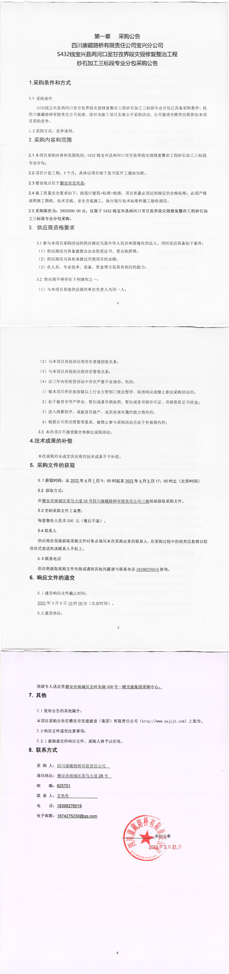 四川康藏路橋有限責(zé)任公司S432線寶興縣兩河口至甘孜界段災(zāi)毀修復(fù)整治工程砂石加工三標段專業(yè)分包采購公告