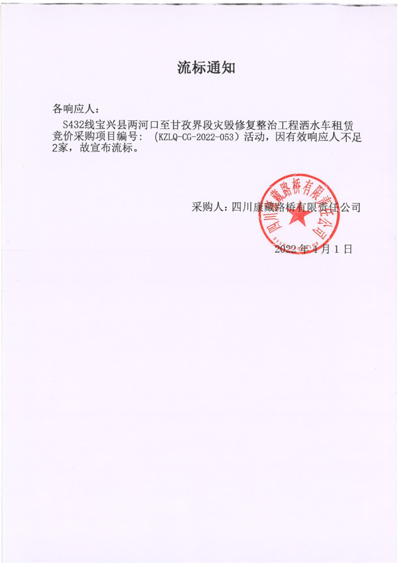 四川康藏路橋有限責(zé)任公司S432線寶興縣兩河口至甘孜界段災(zāi)毀修復(fù)整治工程灑水車租賃競(jìng)價(jià)采購(gòu)項(xiàng)目流標(biāo)通知