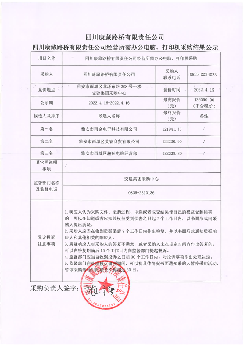 四川康藏路橋有限責任公司經(jīng)營所需辦公電腦、打印機采購結(jié)果公示