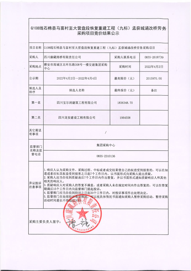 四川康藏路橋有限責任公司G108線石棉縣馬富村至大營盤段恢復重建工程(九標)孟獲城涵改橋勞務采購項目競價結果公示