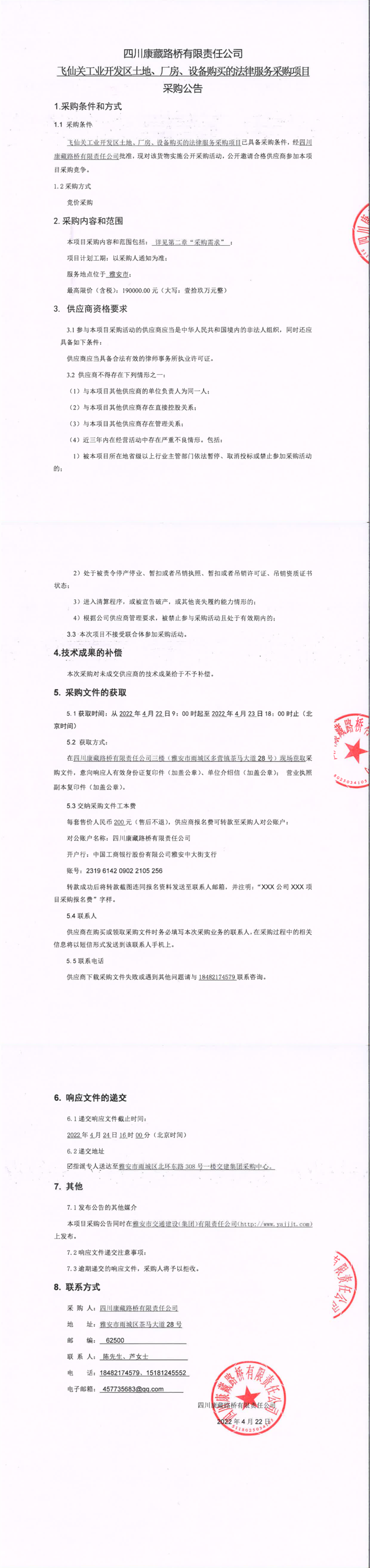四川康藏路橋有限責(zé)任公司飛仙關(guān)工業(yè)開發(fā)區(qū)土地、廠房、設(shè)備購(gòu)買的法律服務(wù)采購(gòu)項(xiàng)目采購(gòu)公告