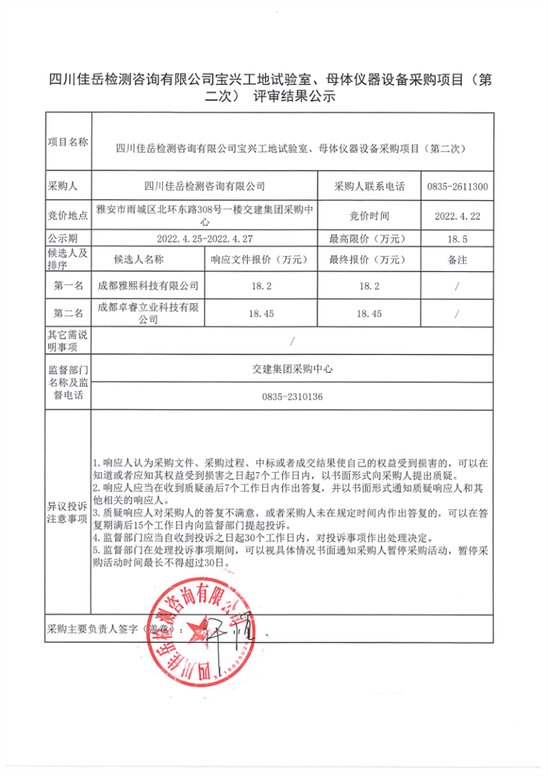 四川佳岳檢測(cè)咨詢有限公司寶興工地試驗(yàn)室、母體儀器設(shè)備采購(gòu)項(xiàng)目(第二次)評(píng)審結(jié)果公示