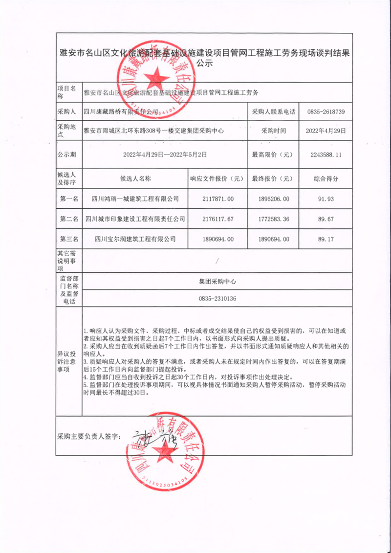 四川康藏路橋有限責任公司雅安市名山區(qū)文化旅游配套基礎設施建設項目管網工程施工勞務現場談判結果公示