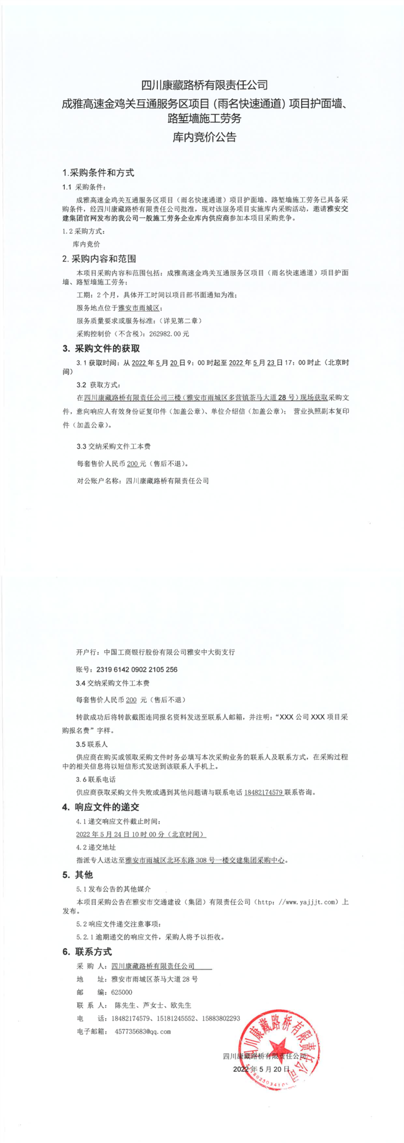 四川康藏路橋有限責任公司成雅高速金雞關互通服務區(qū)項目(雨名快速通道)項目護面墻、路塹墻施工勞務庫內(nèi)競價公告