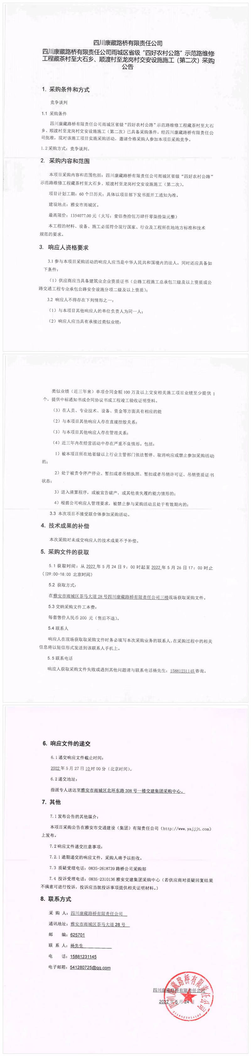 四川康藏路橋有限責任公司雨城區(qū)省級“四好農(nóng)村公路”示范路維修工程藏茶村至大石鄉(xiāng)、順渡村至龍崗村交安設(shè)施施工(第二次)采購公告
