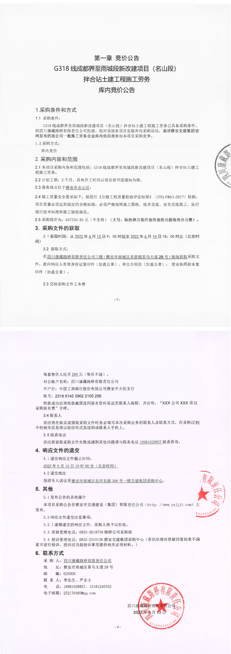 四川康藏路橋有限責(zé)任公司G318線成都界至雨城段新改建項(xiàng)目(名山段)拌合站土建工程施工勞務(wù)庫內(nèi)競(jìng)價(jià)公告