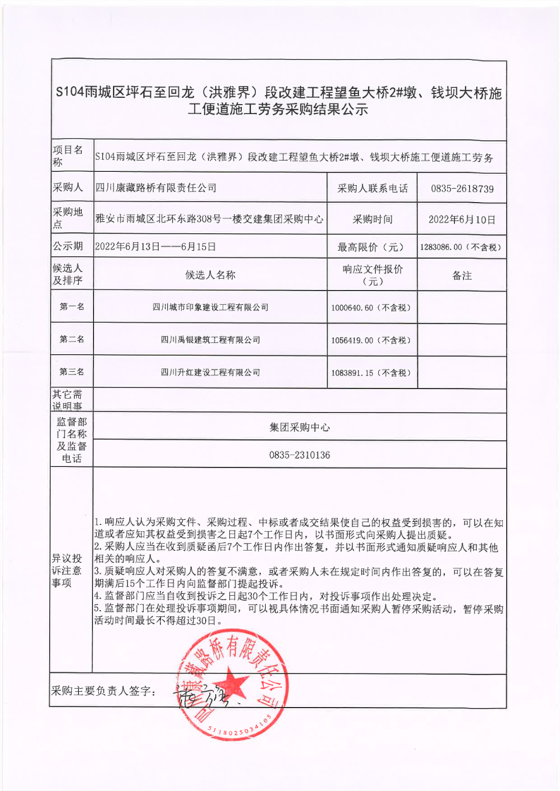 四川康藏路橋有限責(zé)任公司S104雨城區(qū)坪石至回龍(洪雅界)段改建工程望魚大橋2#墩、錢壩大橋施工便道施工勞務(wù)采購(gòu)結(jié)果公示