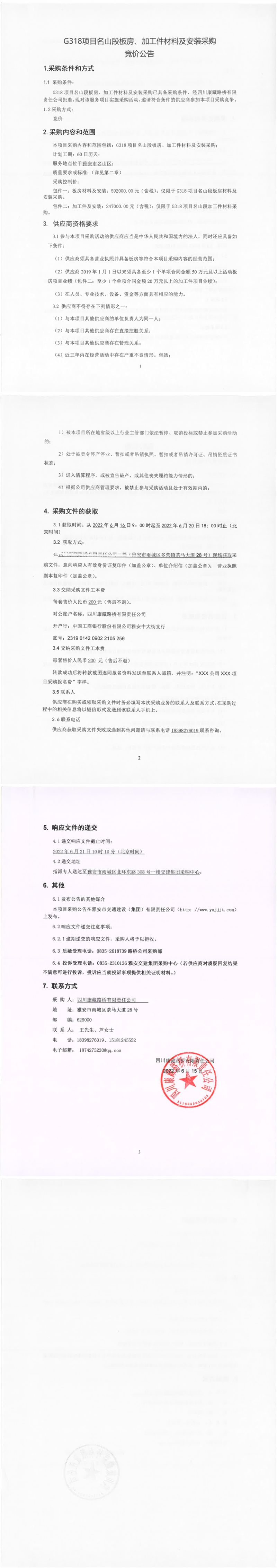 四川康藏路橋有限責(zé)任公司G318項(xiàng)目名山段板房、加工件材料及安裝采購競(jìng)價(jià)公告