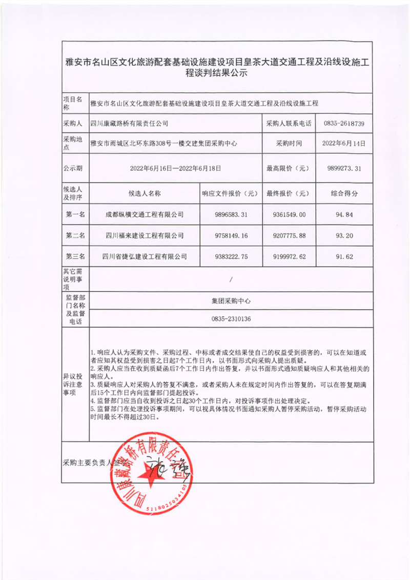 四川康藏路橋有限責(zé)任公司雅安市名山區(qū)文化旅游配套基礎(chǔ)設(shè)施建設(shè)項目皇茶大道交通工程及沿線設(shè)施工程談判結(jié)果公示