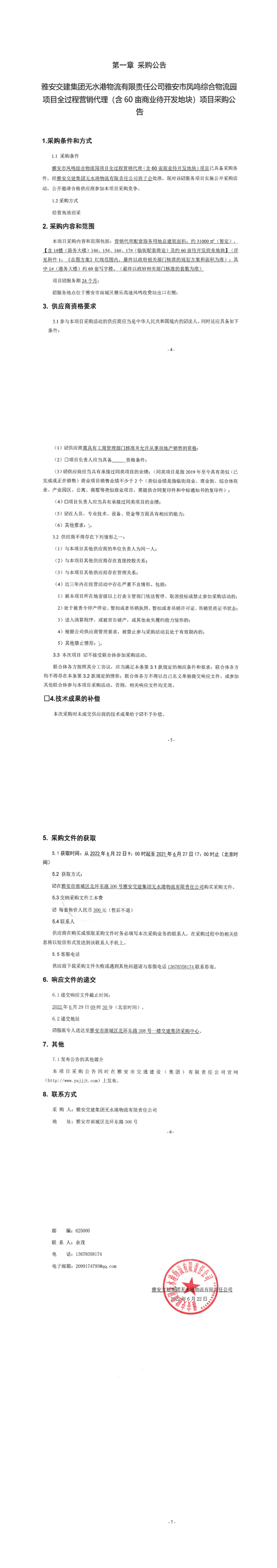 雅安交建集團無水港物流有限責(zé)任公司雅安市鳳鳴綜合物流園項目全過程營銷代理(含60畝商業(yè)待開發(fā)地塊)項目采購公告