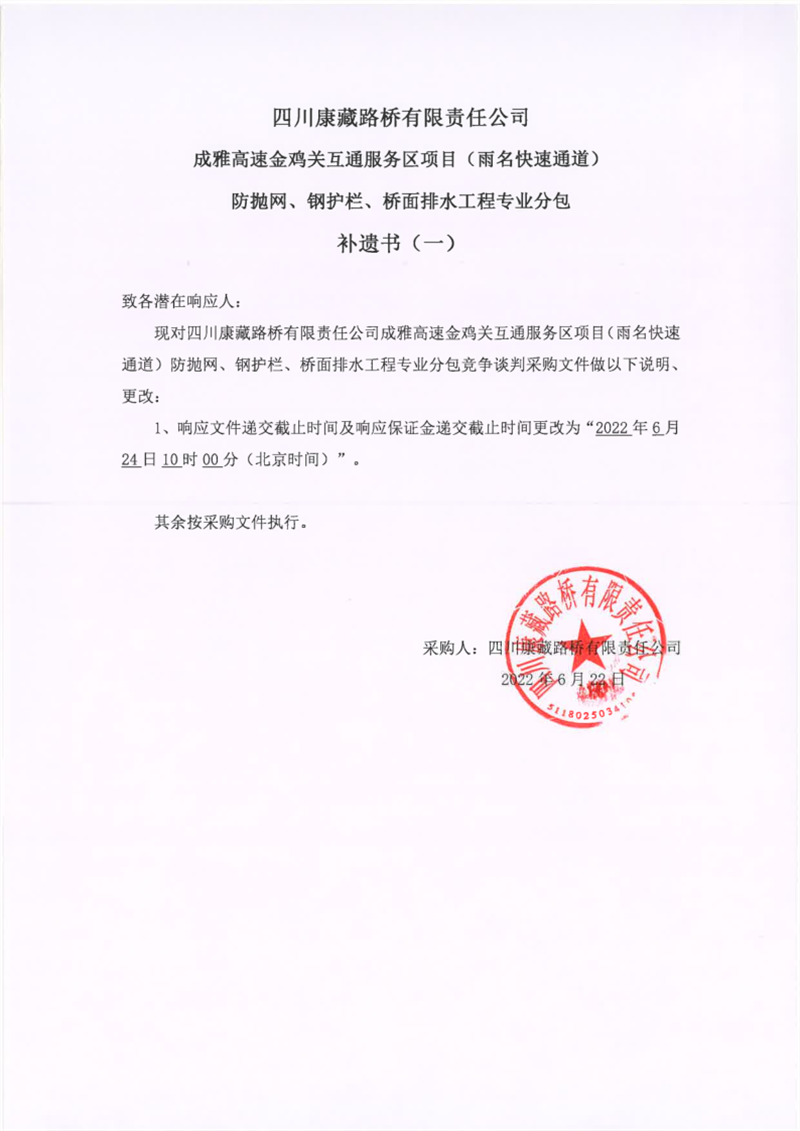 四川康藏路橋有限責任公司成雅高速金雞關(guān)互通服務(wù)區(qū)項目(雨名快速通道)防拋網(wǎng)、鋼護欄、橋面排水工程專業(yè)分包補遺書(一)