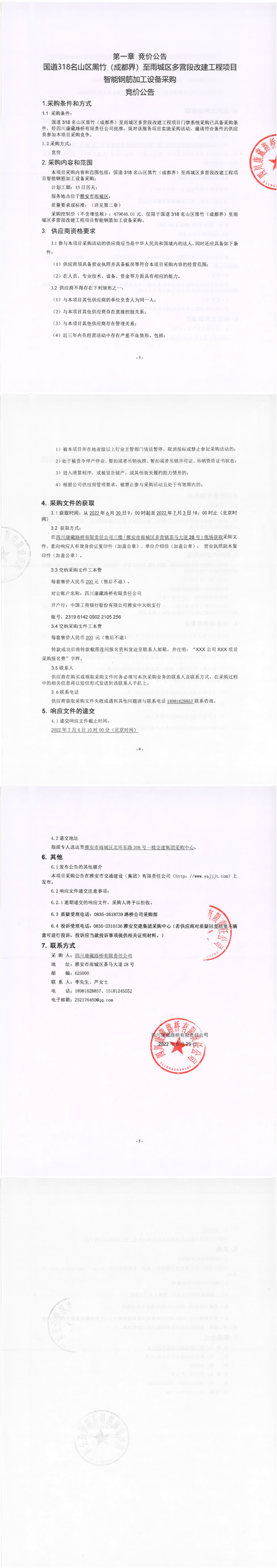 四川康藏路橋有限責任公司國道318名山區(qū)黑竹(成都界)至雨城區(qū)多營段改建工程項目智能鋼筋加工設備采購競價公告