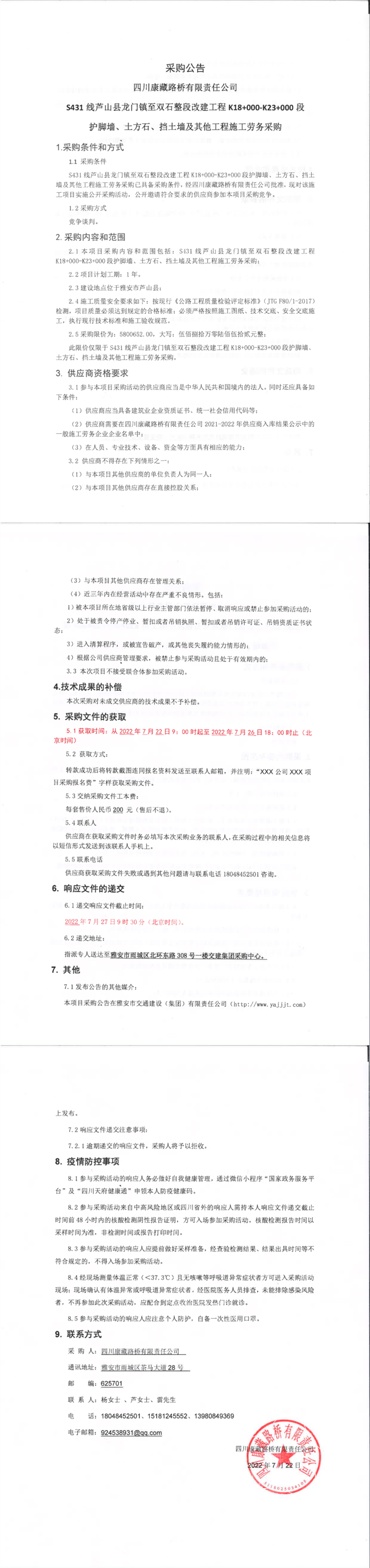 四川康藏路橋有限責(zé)任公司S431線蘆山縣龍門鎮(zhèn)至雙石整段改建工程K18+000-K23+000段護(hù)腳墻、土方石、擋土墻及其他工程施工勞務(wù)采購