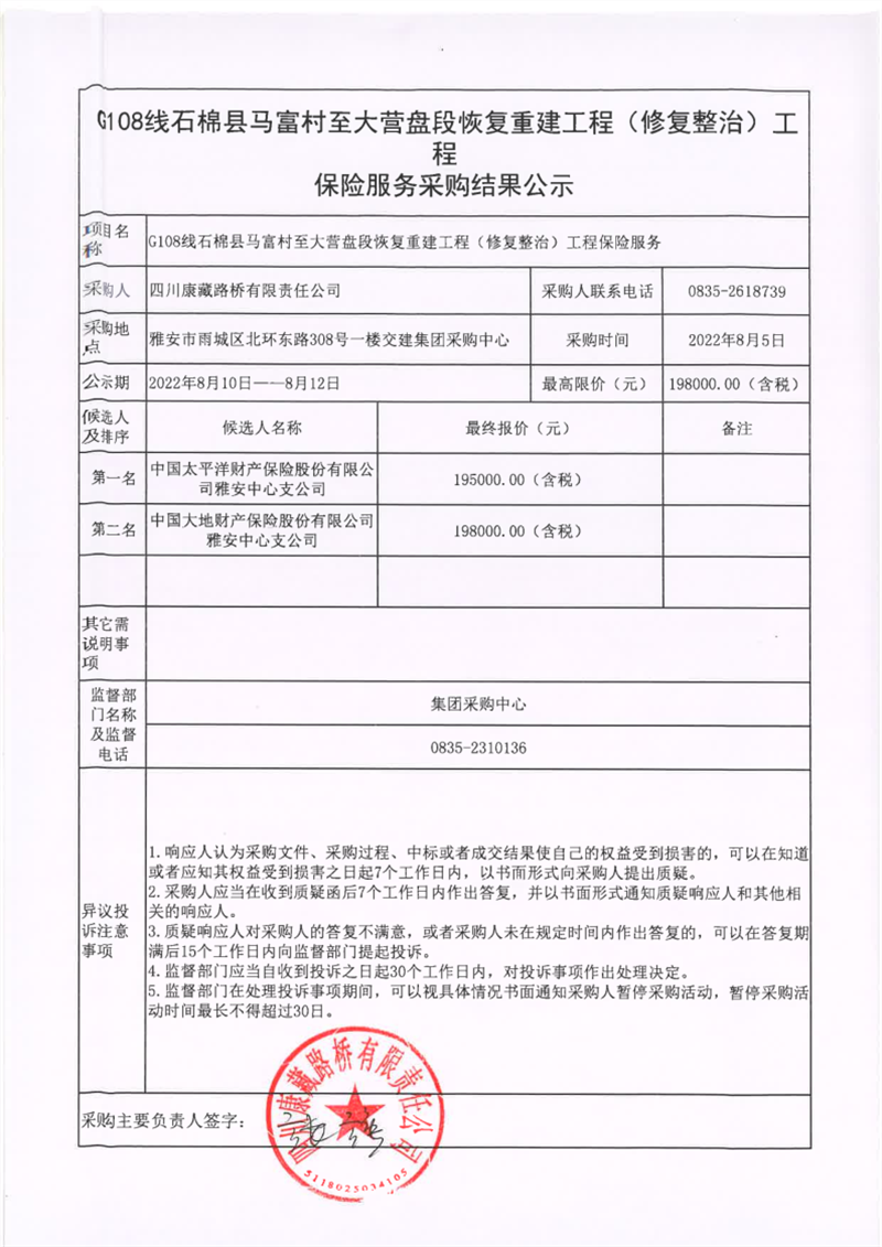 四川康藏路橋有限責(zé)任公司G108線(xiàn)石棉縣馬富村至大營(yíng)盤(pán)段恢復(fù)重建工程(修復(fù)整治)工程保險(xiǎn)服務(wù)采購(gòu)結(jié)果公示