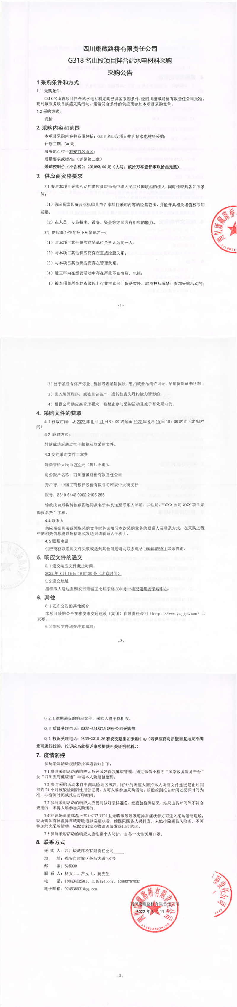 四川康藏路橋有限責任公司G318名山段項目拌合站水電材料采購采購公告