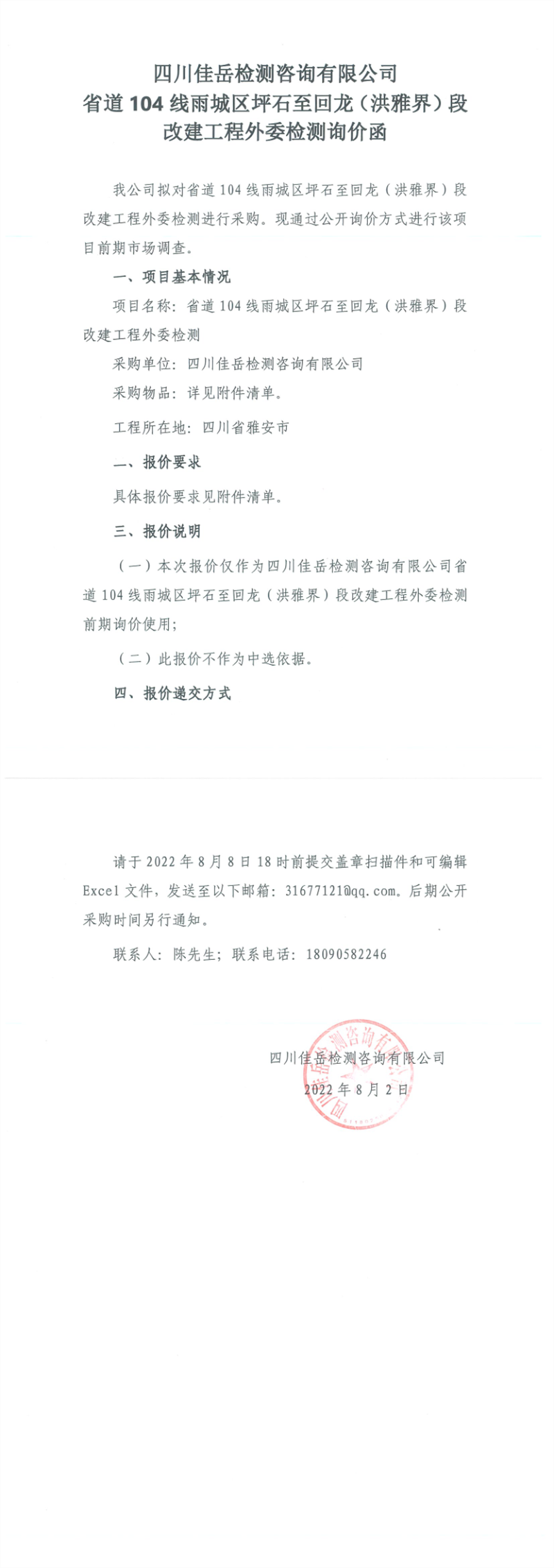 四川佳岳檢測(cè)咨詢有限公司省道104線雨城區(qū)坪石至回龍(洪雅界)段改建工程外委檢測(cè)詢價(jià)函