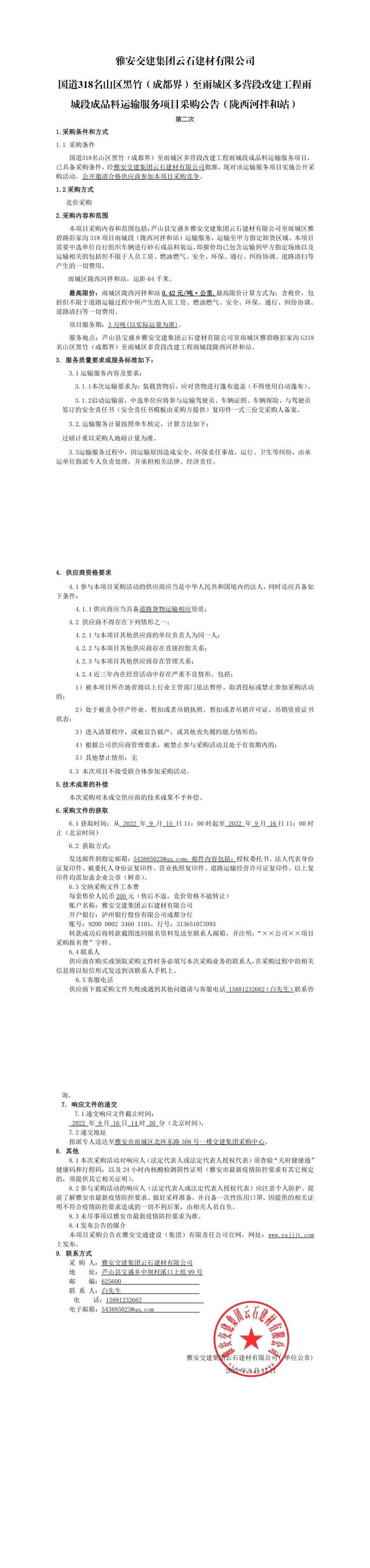 雅安交建集團(tuán)云石建材有限公司國道318名山區(qū)黑竹(成都界)至雨城區(qū)多營段改建工程名山段成品料運(yùn)輸服務(wù)項目采購公告(皇茶大道拌和站)