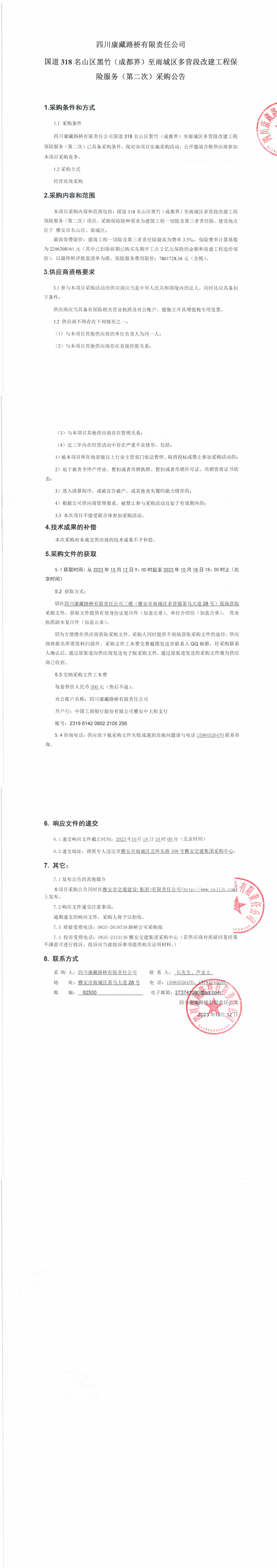 四川康藏路橋有限責(zé)任公司國(guó)道318名山區(qū)黑竹(成都界)至雨城區(qū)多營(yíng)段改建工程保險(xiǎn)服務(wù)(第二次)采購(gòu)公告