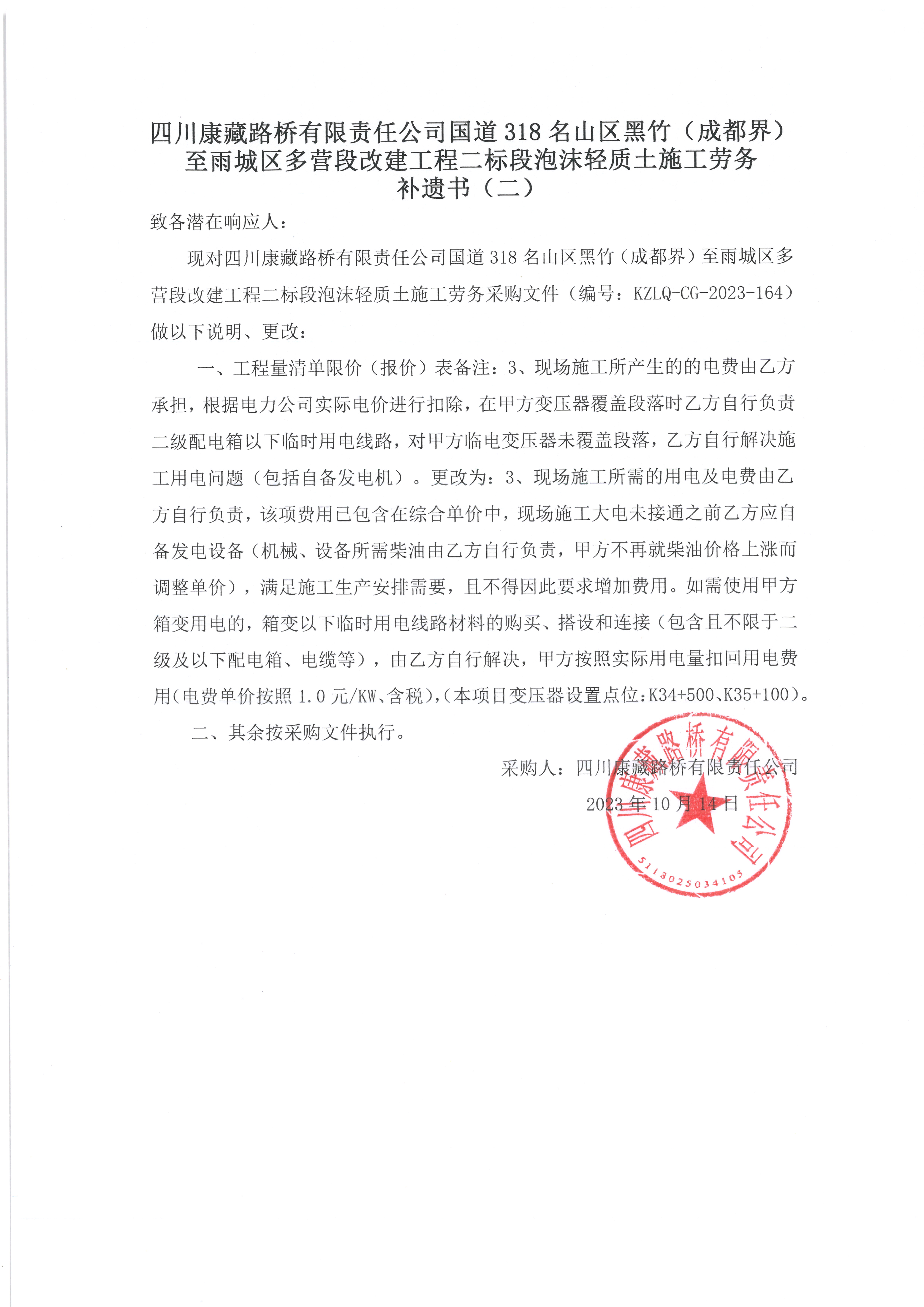 四川康藏路橋有限責(zé)任公司國道318名山區(qū)黑竹(成都界)至雨城區(qū)多營段改建工程二標(biāo)段泡沫輕質(zhì)土施工勞務(wù) 補(bǔ)遺書(二)