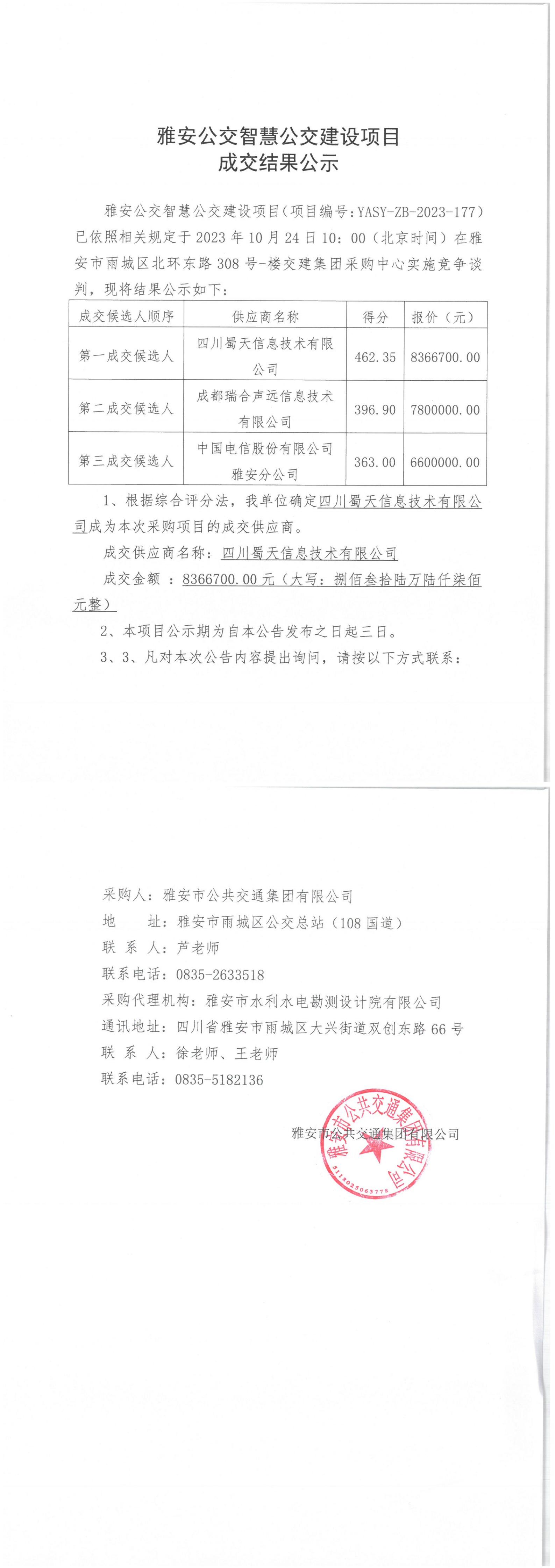 雅安市公共交通集團有限公司雅安公交智慧公交建設(shè)項目成交結(jié)果公示