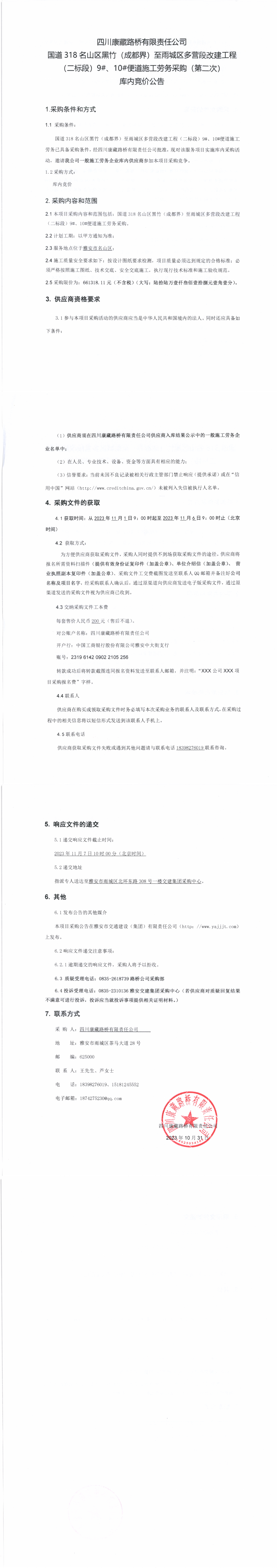 四川康藏路橋有限責任公司國道318名山區(qū)黑竹(成都界)至雨城區(qū)多營段改建工程(二標段)9#、10#便道施工勞務采購(第二次)庫內競價公告