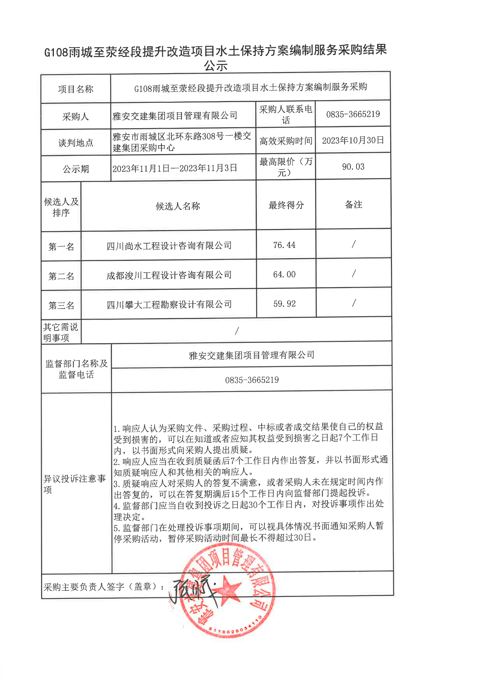 雅安交建集團項目管理有限公司G108雨城至滎經(jīng)段提升改造項目水土保持方案編制服務(wù)采購結(jié)果公示