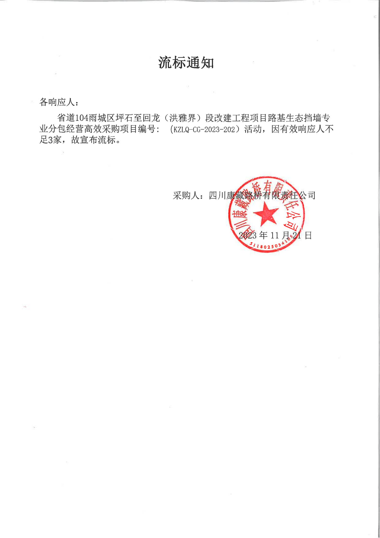 四川康藏路橋有限責任公司省道104雨城區(qū)坪石至回龍(洪雅界)段改建工程項目路基生態(tài)擋墻專業(yè)分包經營高效采購流標通知
