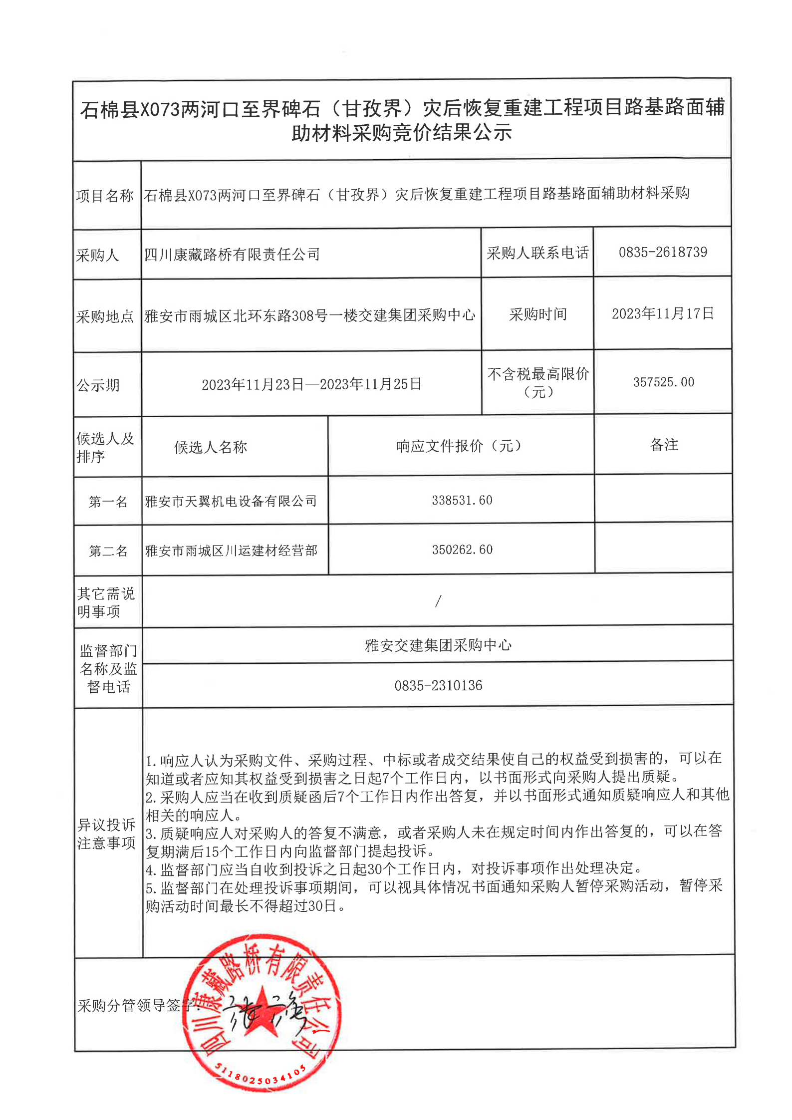 四川康藏路橋有限責任公司石棉縣X073兩河口至界碑石(甘孜界)災(zāi)后恢復(fù)重建工程項目路基路面輔助材料采購結(jié)果公示