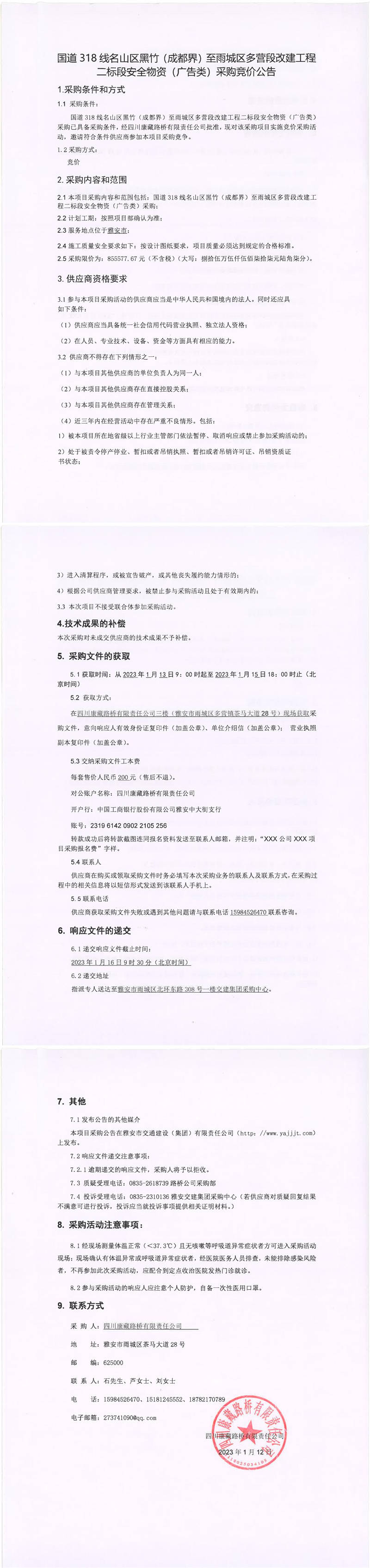 四川康藏路橋有限責(zé)任公司國道318線名山區(qū)黑竹(成都界)至雨城區(qū)多營段改建工程二標(biāo)段安全物資(廣告類)采購競價公告