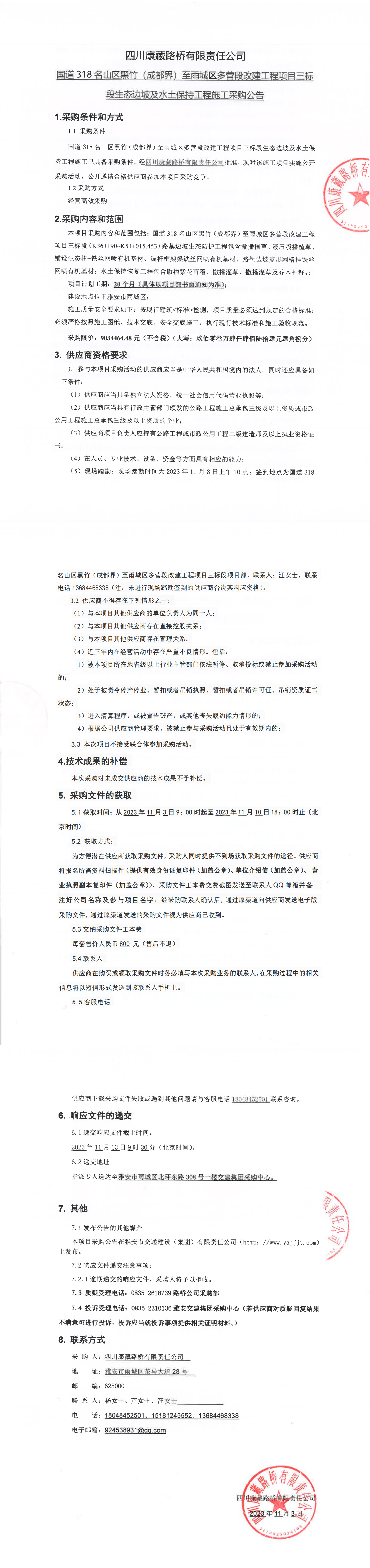四川康藏路橋有限責(zé)任公司國(guó)道318名山區(qū)黑竹(成都界)至雨城區(qū)多營(yíng)段改建工程項(xiàng)目三標(biāo)段生態(tài)邊坡及水土保持工程施工采購(gòu)公告