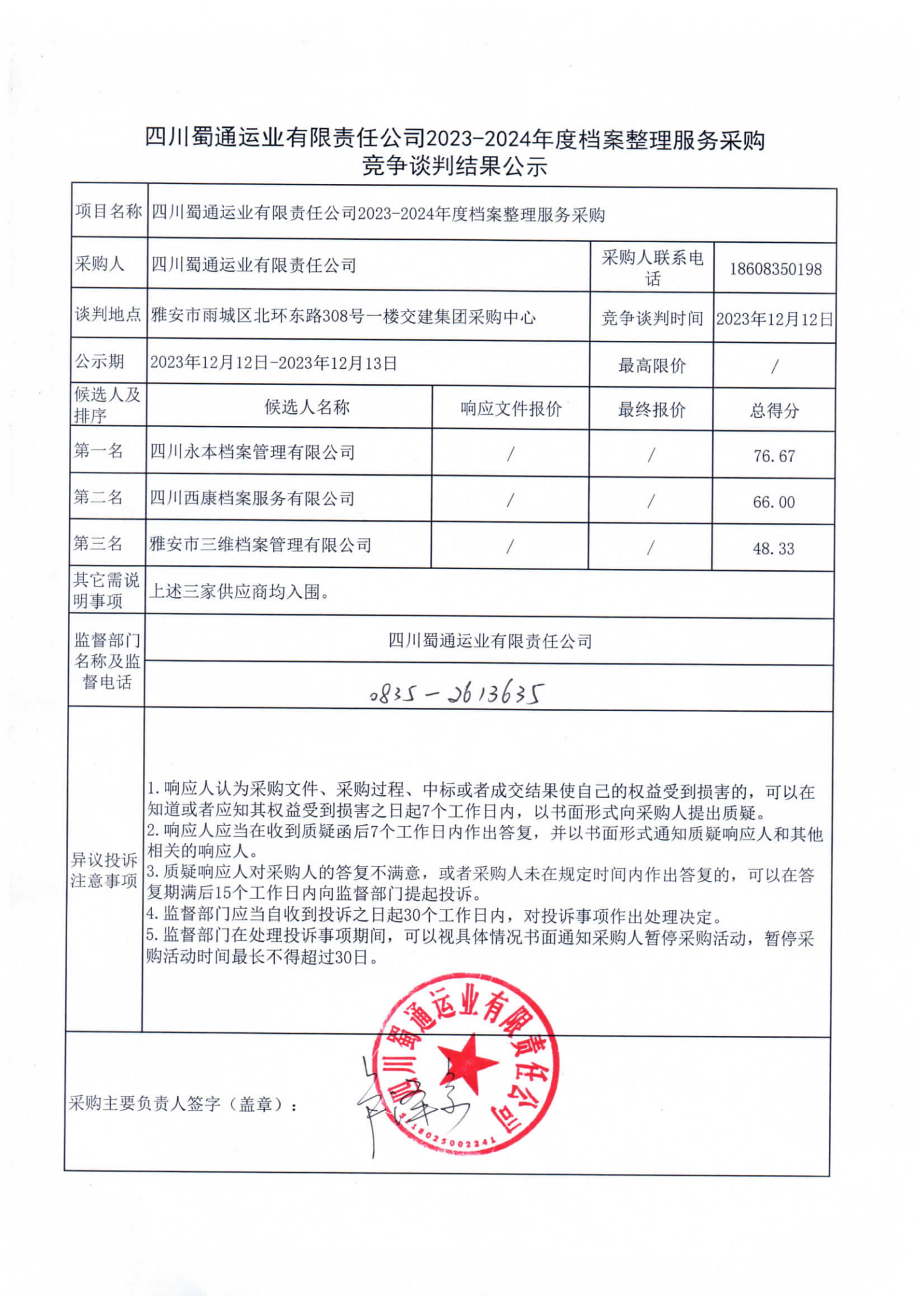 四川蜀通運(yùn)業(yè)有限責(zé)任公司2023-2024年度檔案整理服務(wù)采購競(jìng)爭(zhēng)談判結(jié)果公示