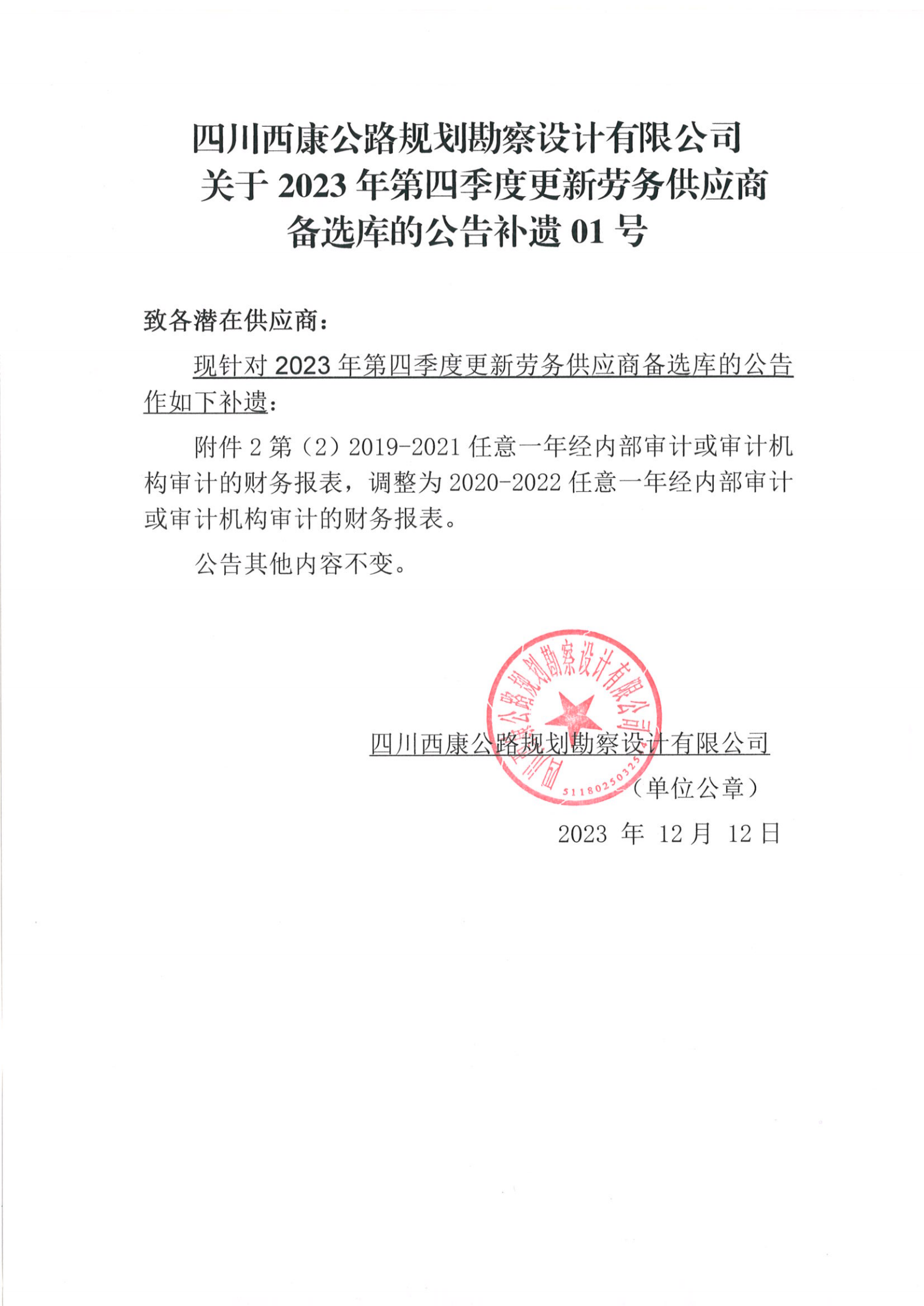 四川西康公路規(guī)劃勘察設(shè)計有限公司關(guān)于2023年第四季度更新勞務(wù)供應(yīng)商備選庫的公告補遺01號