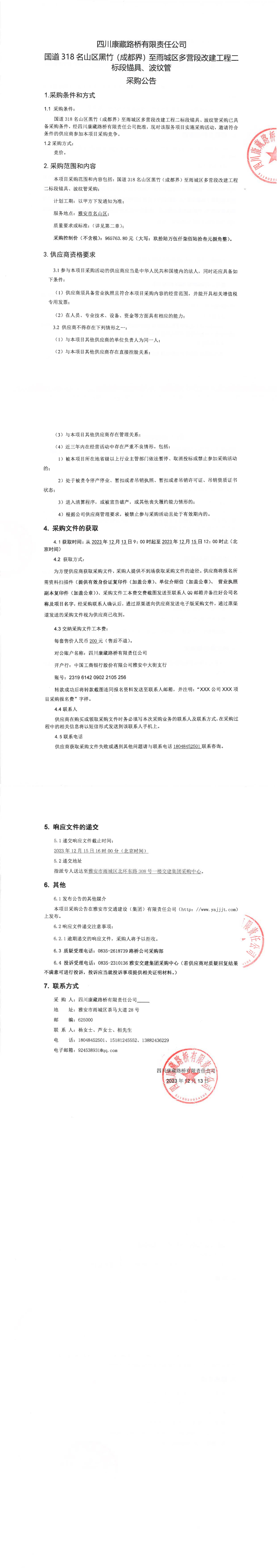 四川康藏路橋有限責(zé)任公司國道318名山區(qū)黑竹(成都界)至雨城區(qū)多營段改建工程二標(biāo)段錨具、波紋管采購公告