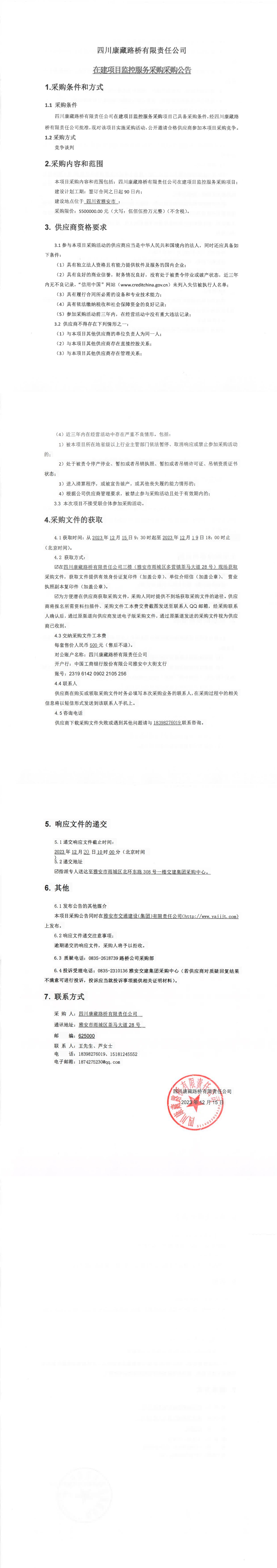 四川康藏路橋有限責任公司在建項目監(jiān)控服務采購公告