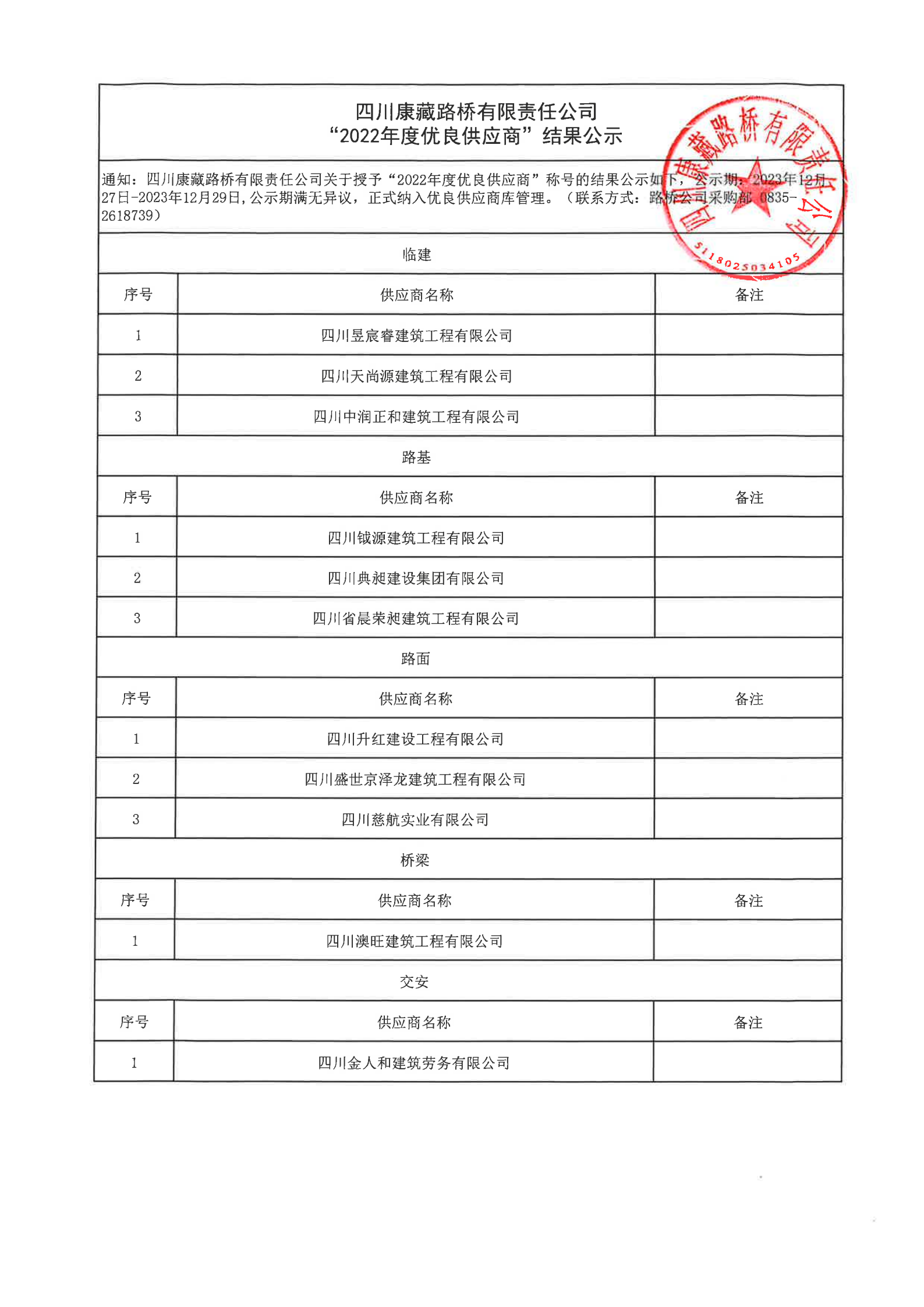 四川康藏路橋有限責任公司“2022年度優(yōu)良供應商”結(jié)果公示