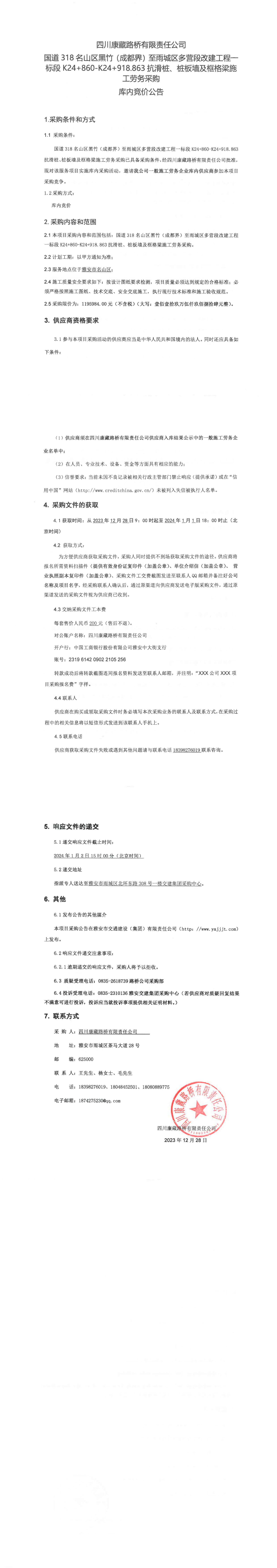 四川康藏路橋有限責(zé)任公司國(guó)道318名山區(qū)黑竹(成都界)至雨城區(qū)多營(yíng)段改建工程一標(biāo)段K24+860-K24+918.863抗滑樁、樁板墻及框格梁施工勞務(wù)采購(gòu)庫(kù)內(nèi)競(jìng)價(jià)公告