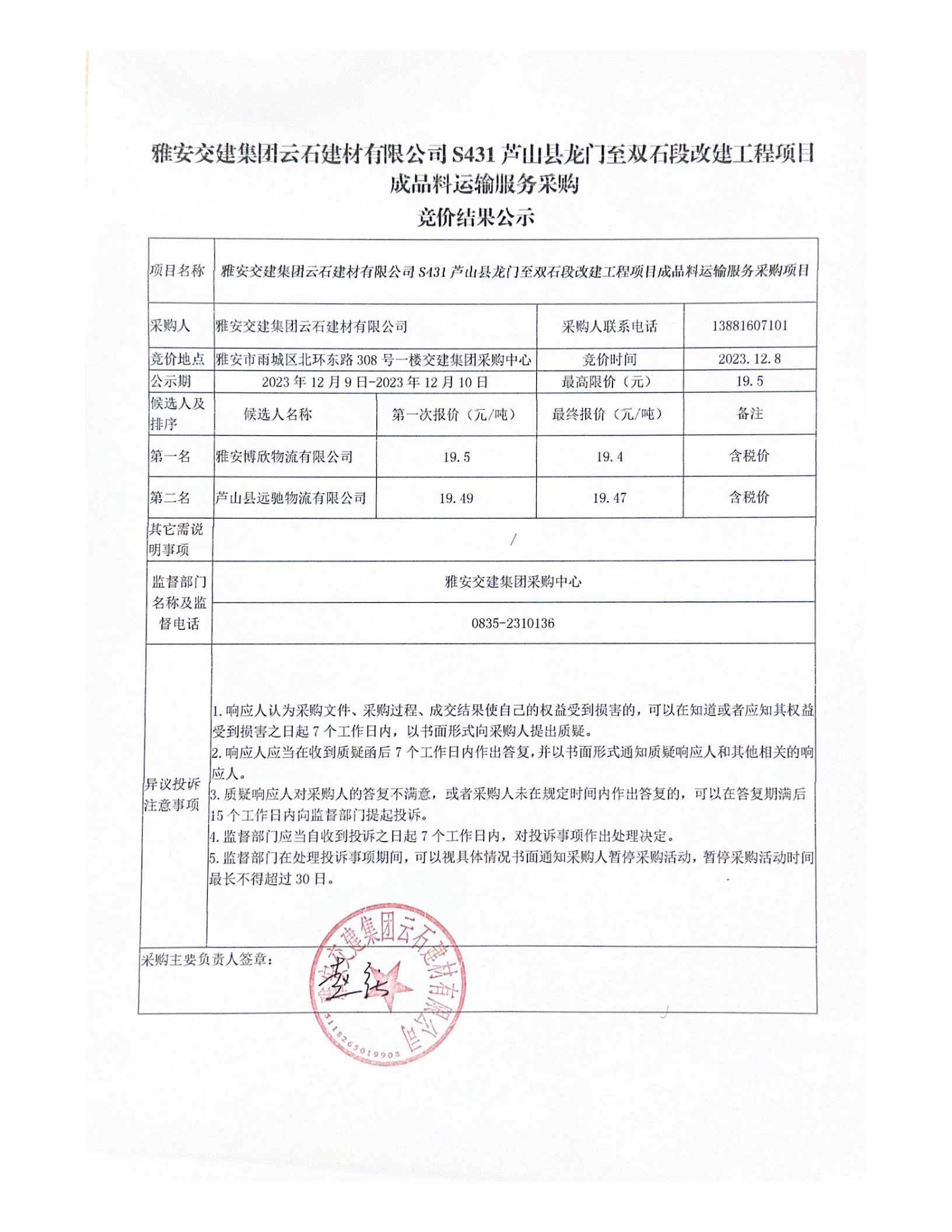 雅安交建集團云石建材有限公司S431蘆山縣龍門至雙石段改建工程項目成品料運輸服務(wù)采購競價結(jié)果公示