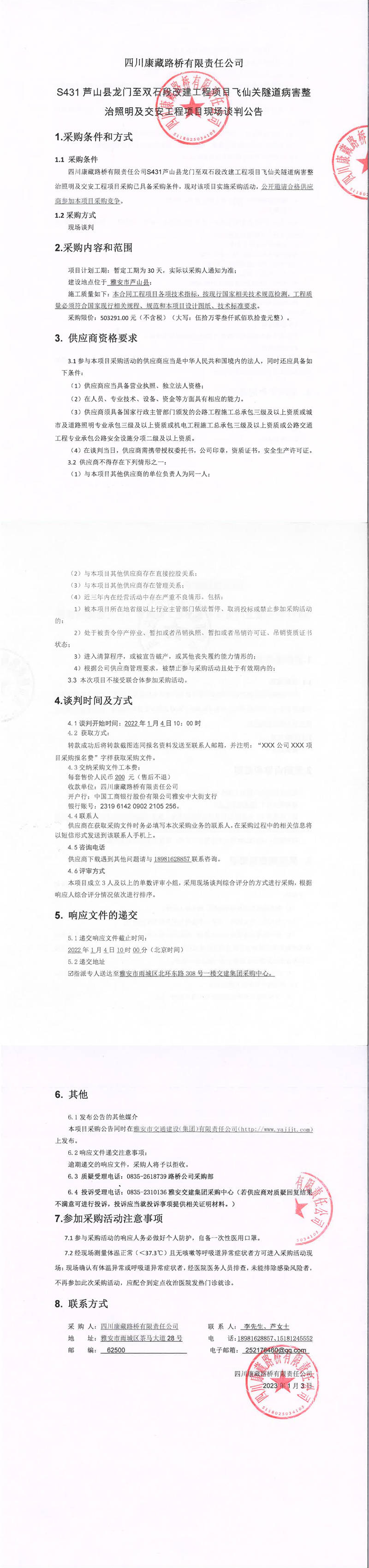 四川康藏路橋有限責任公司S431蘆山縣龍門至雙石段改建工程項目飛仙關(guān)隧道病害整治照明及交安工程項目現(xiàn)場談判公告
