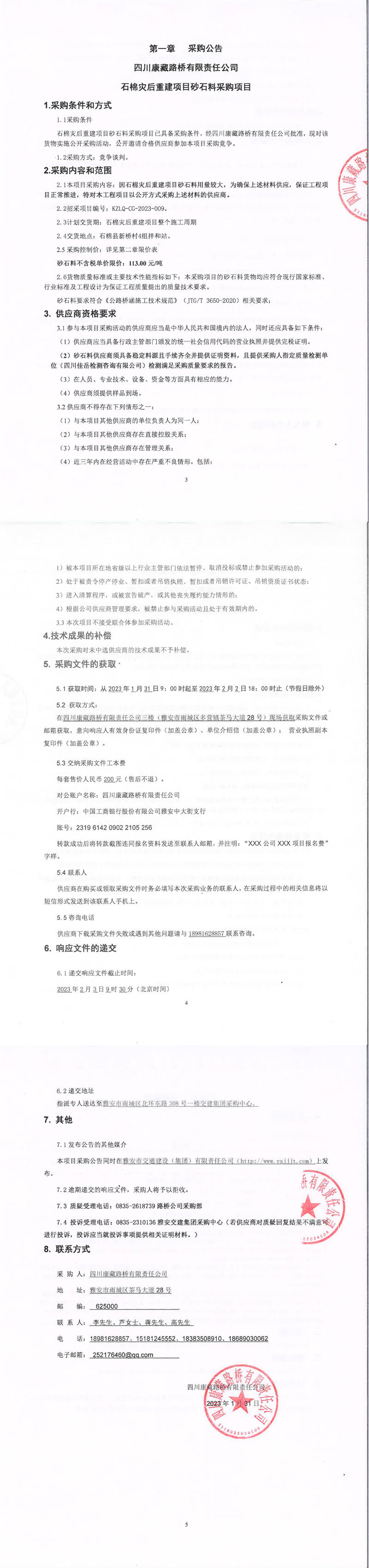 四川康藏路橋有限責(zé)任公司石棉災(zāi)后重建項目砂石料采購項目采購公告